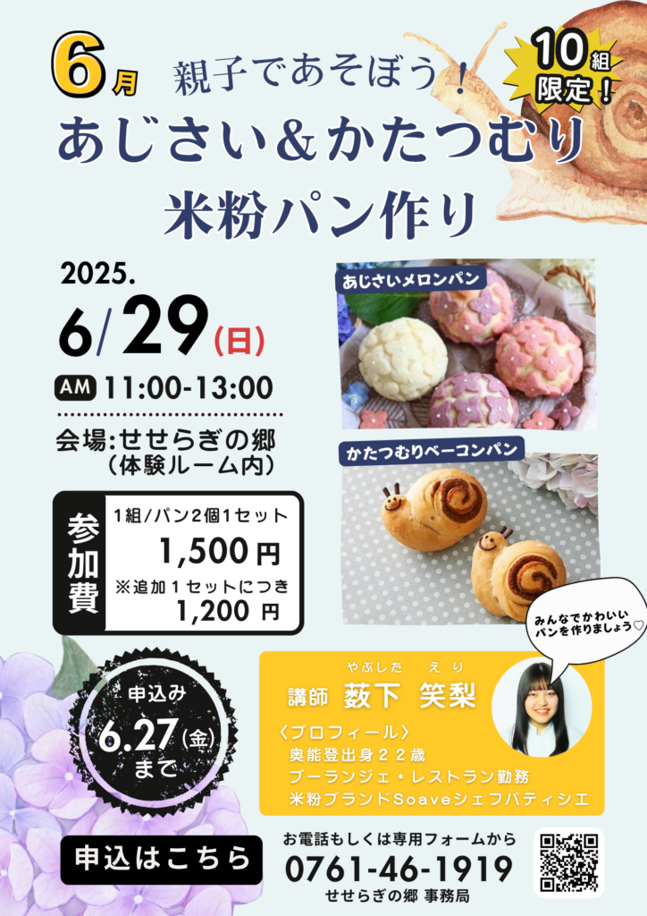 せせらぎの郷では、「季節と遊ぶ」をテーマに体験イベントを行っております〇6月もご家族で楽しめる企画をご用意しましたのでこの機会にぜひ、みなさんでご参加ください! 【企画詳細】 \親子で遊ぼう!米粉のあじさい&かたつむりパン作り/ 日程:2025...
