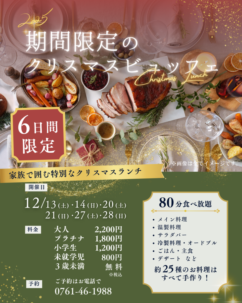 クリスマスならではのメイン料理をはじめ、揚げ物、サラダ、あたたかい煮込み料理、手づくりデザートまで約25種類、幅広くご用意。できたての美味しさを家族みんなで味わえる、特別なランチタイムをお楽しみいただけます。